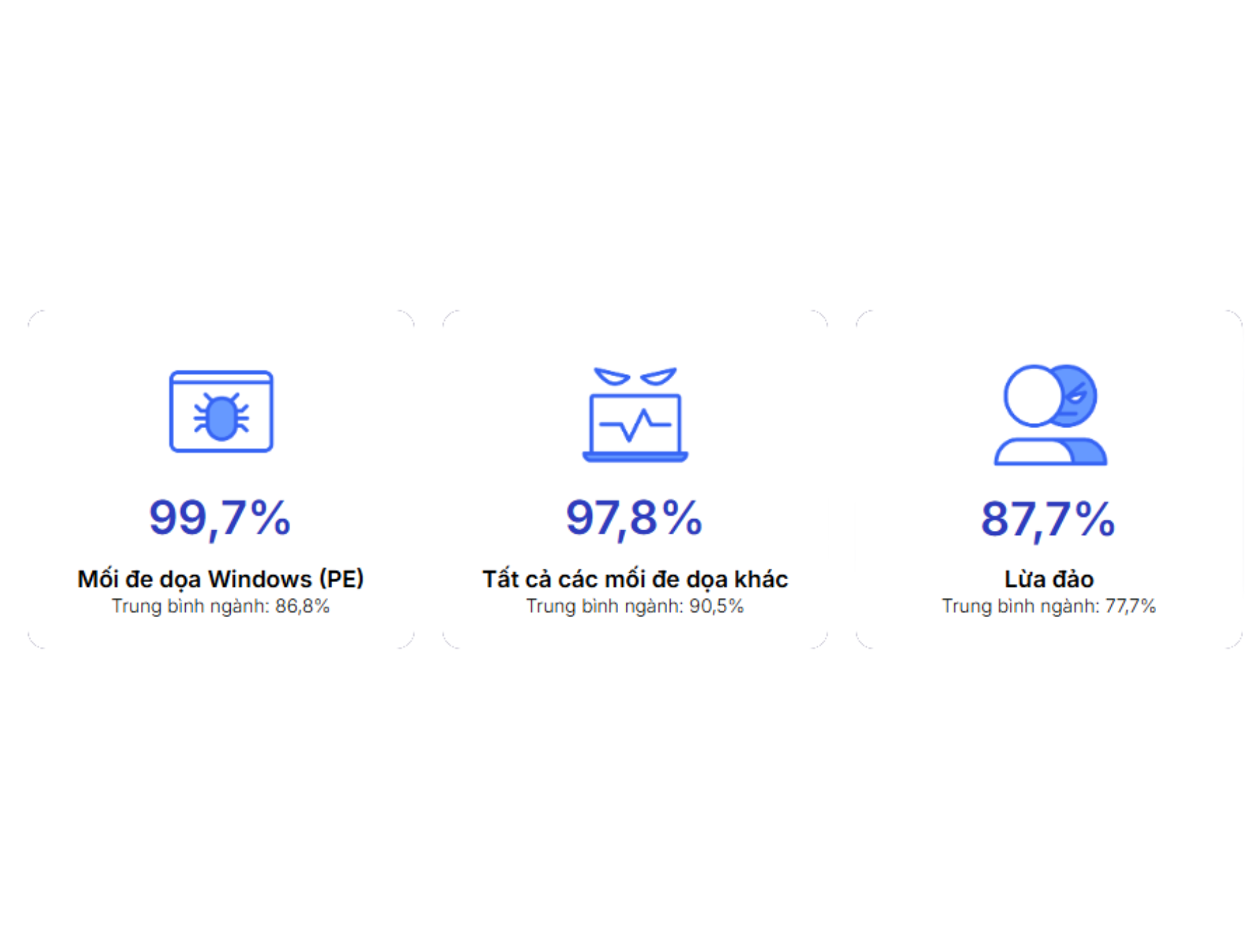 - 99,7% tỷ lệ phát hiện phần mềm độc hại trên Windows, cao hơn mức trung bình ngành 86,8%.