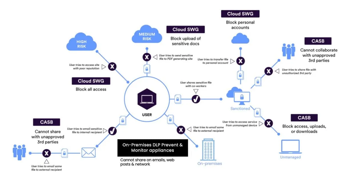 SSE không chỉ giám sát dữ liệu mà còn phân loại, thực thi và xử lý sự cố trên toàn bộ môi trường làm việc. Với DLP thống nhất trên điểm cuối, đám mây và web, SSE giúp doanh nghiệp kiểm soát hợp tác theo thời gian thực và thực thi chính sách dựa trên rủi ro thích ứng cho hơn 40.000 ứng dụng.