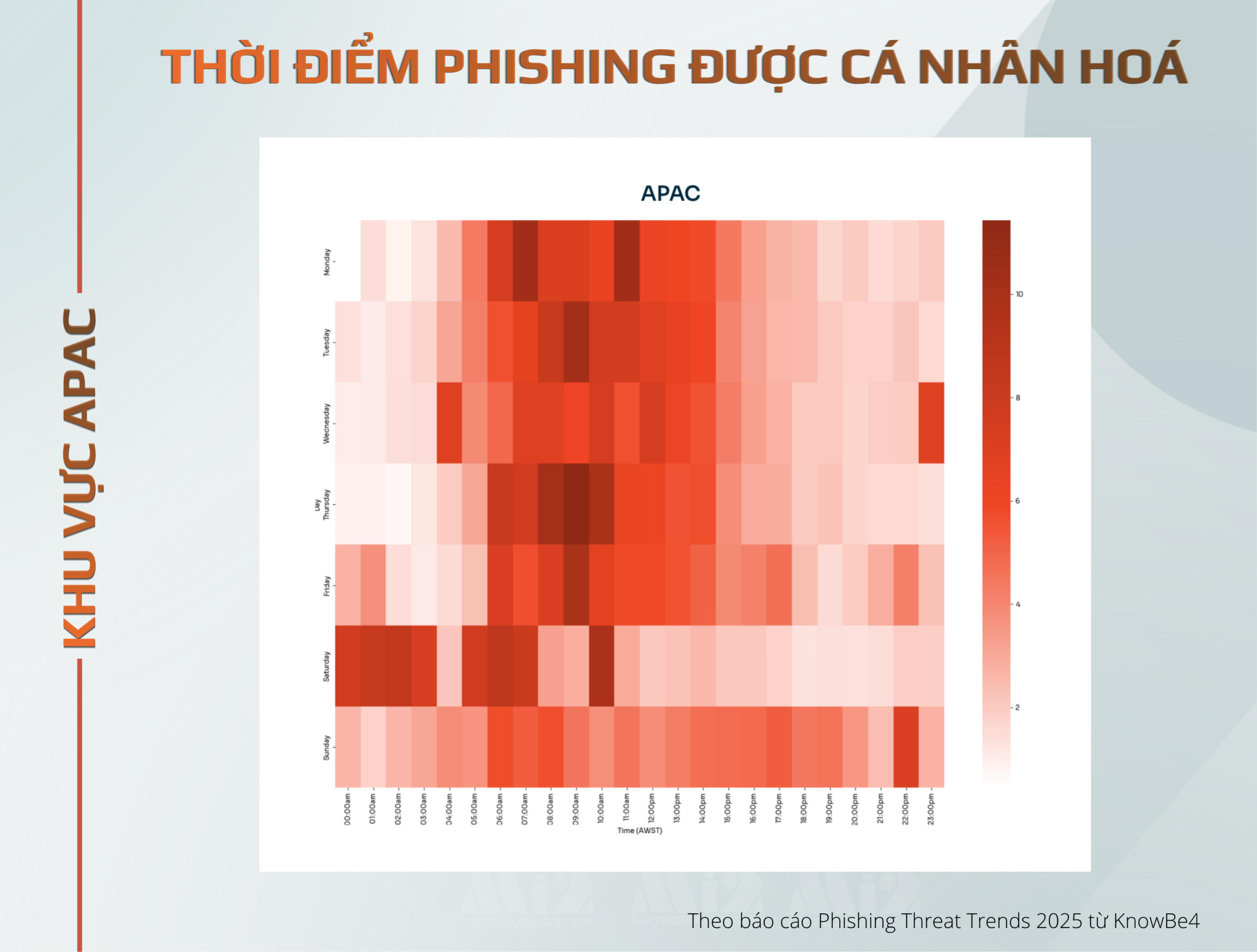 Dữ liệu tại khu vực APAC cho thấy các cuộc tấn công phishing được phân bổ rất sát với thói quen làm việc của người dùng. Cụ thể, tấn công tập trung mạnh nhất vào buổi sáng và đầu giờ chiều trong các ngày làm việc, với đỉnh điểm rơi vào khoảng 7h – 11h sáng.